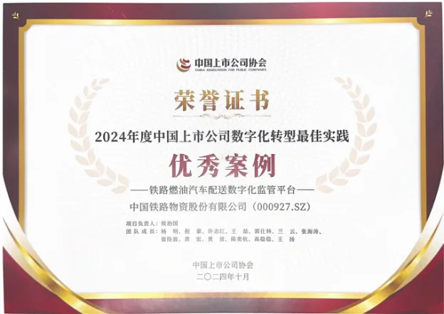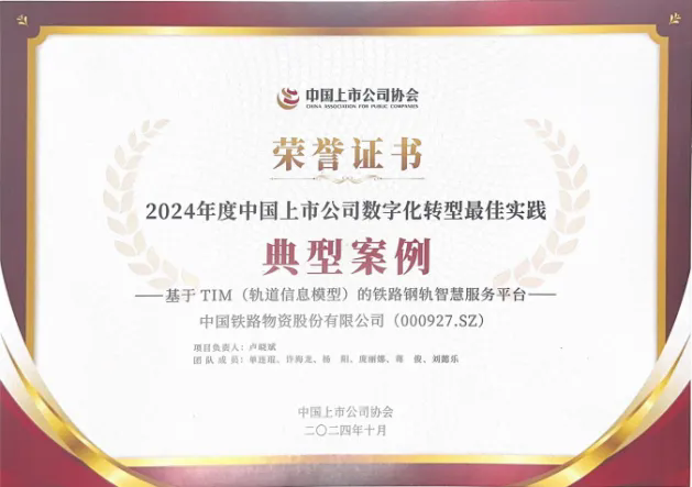 日前,best365足球彩票官网自主研发的“铁路燃油汽车配送数字化监管平台”“基于 TIM(轨道信息模型)的铁路钢轨智慧服务平台”荣获中国上市公司协会颁发的2024年度中国上市公司数字化转型最佳实践“优秀案例”和“典型案例”,为行业数字化发展树立了标杆。